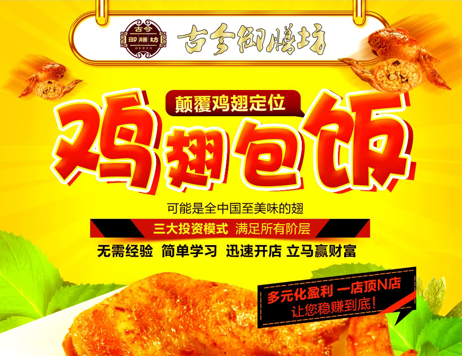 3、鸡翅包饭的区域代理,du家经营----可发展二级加盟店,费用全额归代理商所有。同时,公司为代理商提供统一的招商广告和专项广告支持,协助代理商开拓市场,确保各代理获利。运筹帷幄,就能让全城的商家为你赚赚赚,自然财源滚滚来。